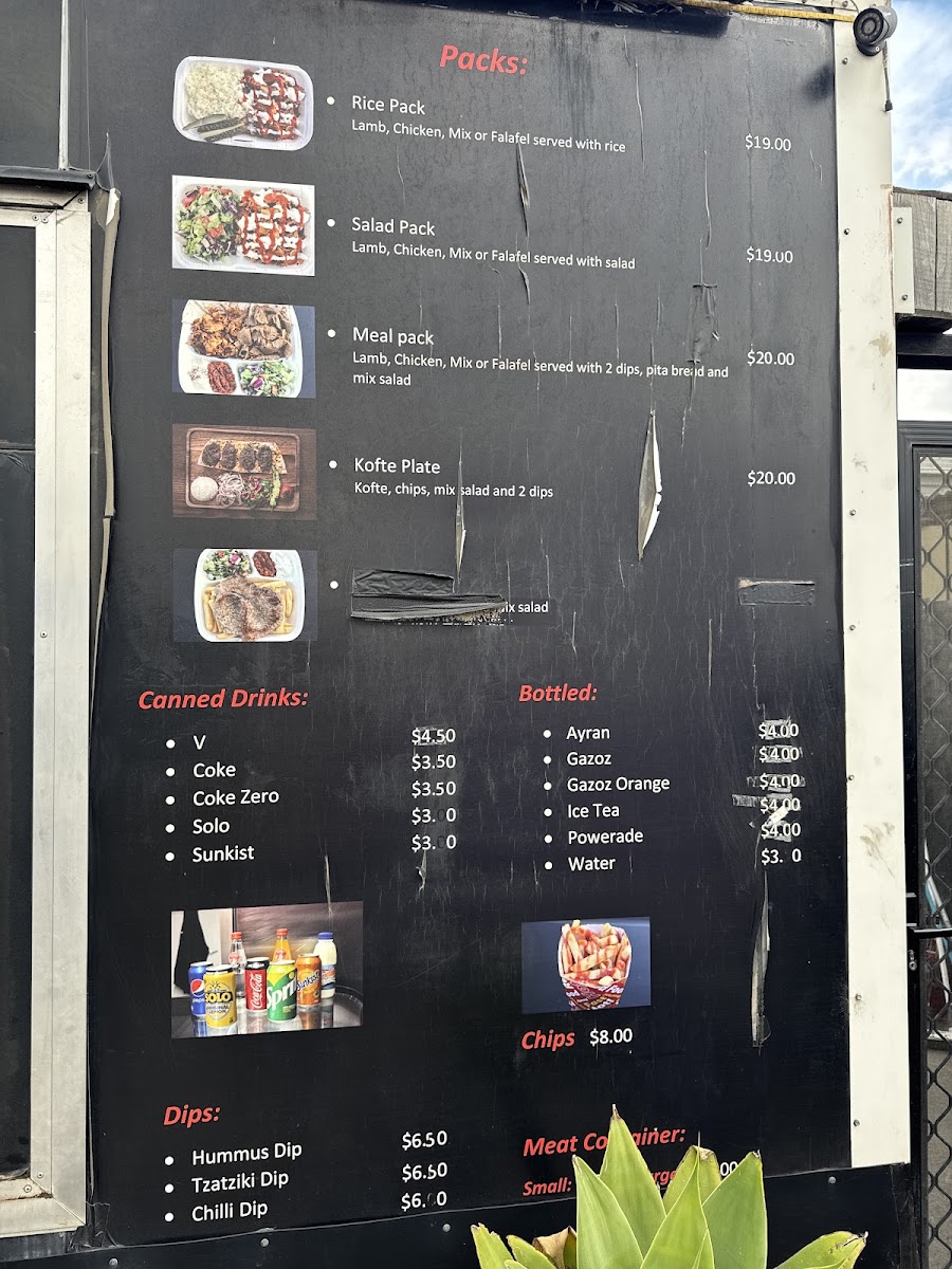 Lamb, chicken, mixed meat or falafel kebab served with small chips and a canned drink of choice